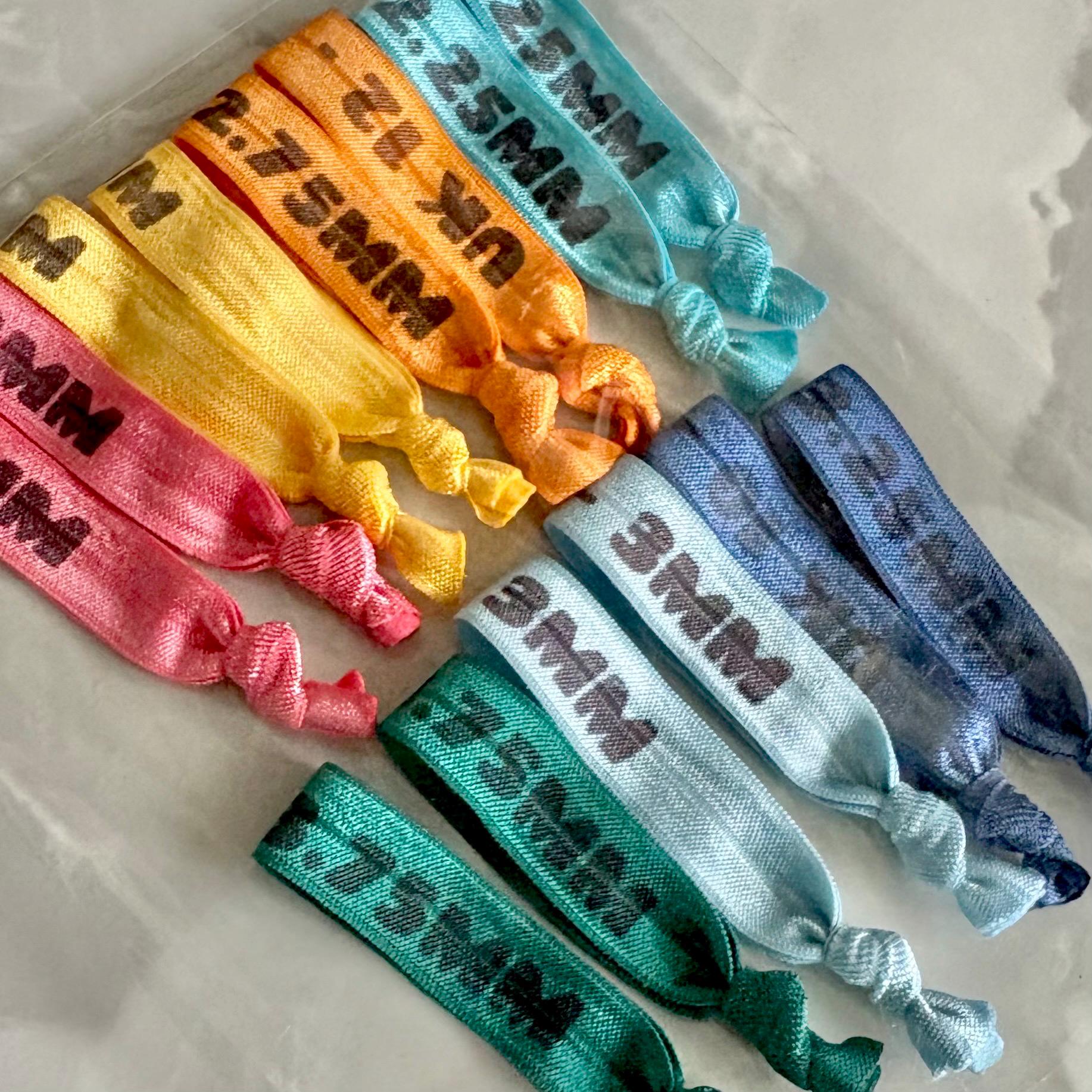 The text may appear slightly different when printed on the ties depending on the colour elastic.